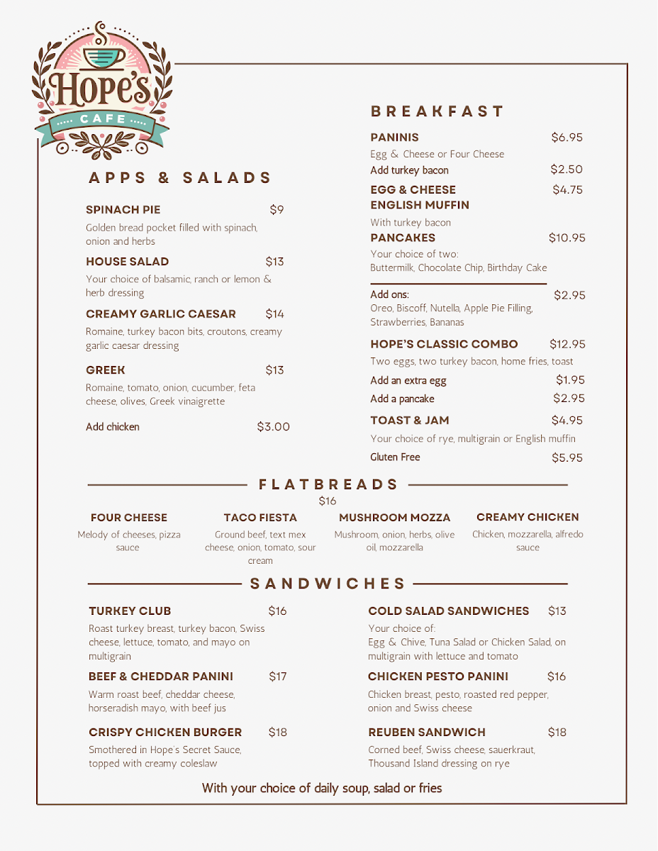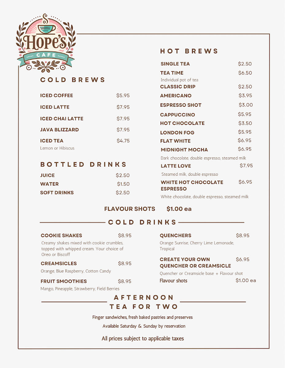 The menu at Hope's Cafe is a delightful showcase of delicious offerings. Indulge in their scrumptious Turkey Club sandwich, expertly loaded with savory turkey, crisp lettuce, and fresh tomato for just CA$16.00. For those craving something warm and hearty, the Chicken Pesto Panini is a must-try, marrying the tangy notes of pesto with tender chicken—an explosion of flavor guaranteed to leave your taste buds singing!